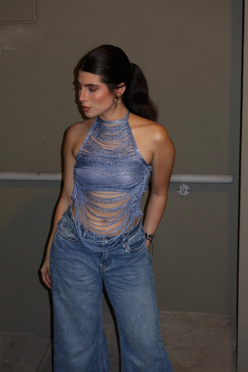 ¡La prenda definitiva para ser el alma de la fiesta! Conoce el Top Vibes ✨ Disponible en 6 tonos explosivos para cada personalidad: Negro, Oro Rosa, Verde Oliva, Negro/Verde, Fucsia y Morado. Este top tipo «babero» está confeccionado en una deslumbrante malla de lentejuelas que cae con fluidez, creando un seductor escote profundo en V al frente. Su espalda es pura audacia: totalmente descubierta y sujeta únicamente por una delicada cadena metálica que cruza y se ajusta a tu medida, funcionando como una joya directamente sobre tu piel. Con la calidad y ese sello GINEBRA para deslumbrar en tu próximo concierto, festival o noche de rumba. ¡Puro fuego y movimiento!