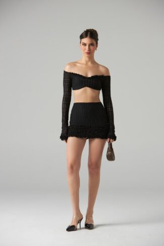 La mezcla perfecta entre dulzura y seducción: ¡Set Swan Reve! 🖤✨ Un conjunto de dos piezas confeccionado en un tejido texturizado único. El crop top presenta un escote off-shoulder (hombros descubiertos) con mangas largas y delicados boleros en los bordes. La minifalda a juego, con su terminación en volante, añade un movimiento coqueto e irresistible. Con la calidad y ese sello GINEBRA que te asegura un look femenino, enigmático y diseñado para robar corazones. ¡Un sueño hecho realidad!