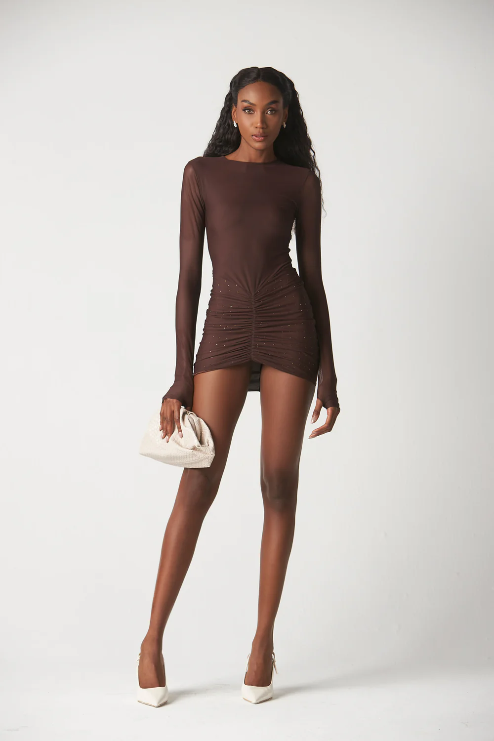 Seducción en estado puro: ¡Caviar Mesh Shiny! 🖤🤎 Un mini vestido de manga larga confeccionado en una malla stretch delicada, salpicada de brillos sutiles como caviar. Su diseño presenta un drapeado central estratégico que estiliza la figura y añade textura. Con la calidad y ese sello GINEBRA que te asegura un look misterioso, elegante y diseñado para que seas el centro de todas las miradas. ¡Prepárate para brillar con sutileza!