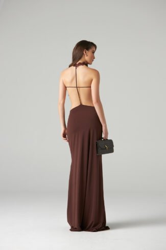 El vestido diseñado para dejar una impresión imborrable: ¡La Nuit Maxi! 🖤🤎 Disponible en un profundo negro o un sofisticado café chocolate. Esta pieza es una oda a la seducción refinada. Presenta un top de encaje en forma de diamante (tipo pañuelo) que se ajusta perfectamente al busto, creando unos dramáticos cut outs en la cintura que conectan con una falda larga de caída fluida. ¿La sorpresa? Una espalda de infarto casi completamente descubierta, enmarcada por finas tiras que sostienen el top y se unen a una gargantilla (choker) de encaje a juego. Con la calidad y ese sello GINEBRA para la mujer que ama el «dark glamour»