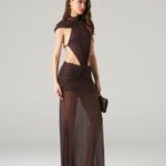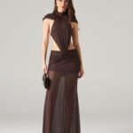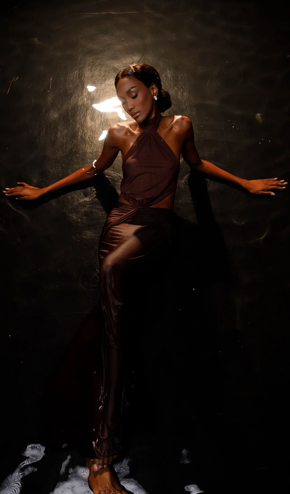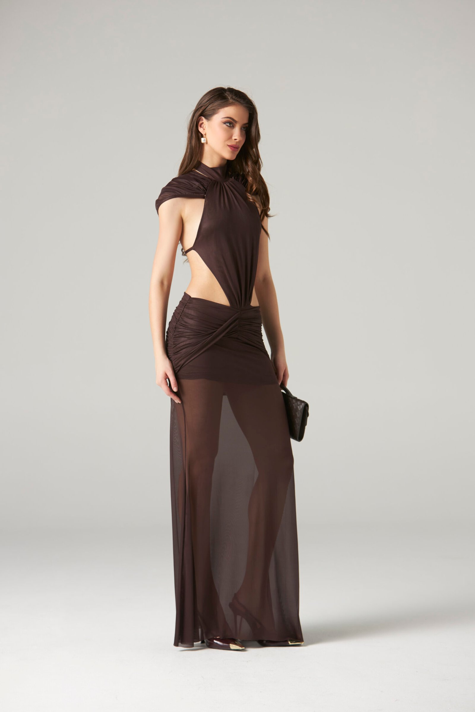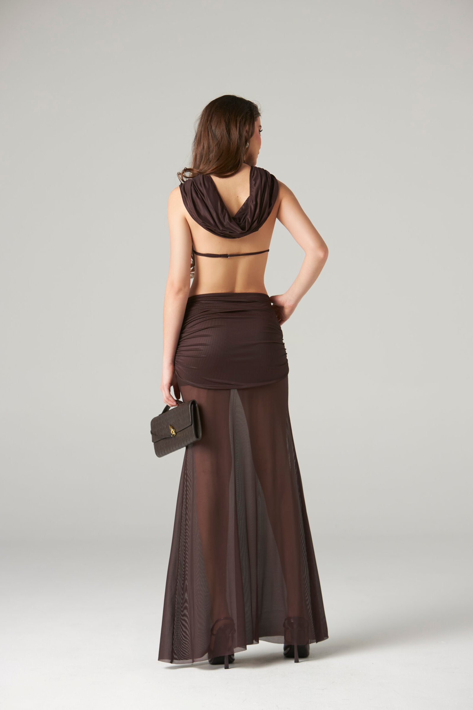 Una declaración de estilo oscuro y sofisticado: Saudi Mesh Dress Expresso ☕✨ Un diseño de alta costura en un profundo tono café expresso que es pura elegancia enigmática. Confeccionado en malla stretch que se adapta a tu cuerpo, presenta una capucha dramática que cae sobre un top halter con espalda descubierta. La cintura drapeada da paso a una falda larga transparente que revela sutilmente tus piernas. Con la calidad y ese sello GINEBRA que te asegura un look vanguardista, diseñado para la mujer que no teme mostrar su lado más audaz y misterioso. ¡Inolvidable!