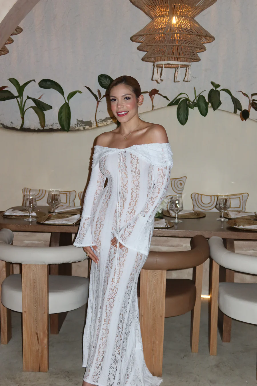 - Peinado: Ondas playeras sueltas, un recogido desenfadado o una trenza espiga.